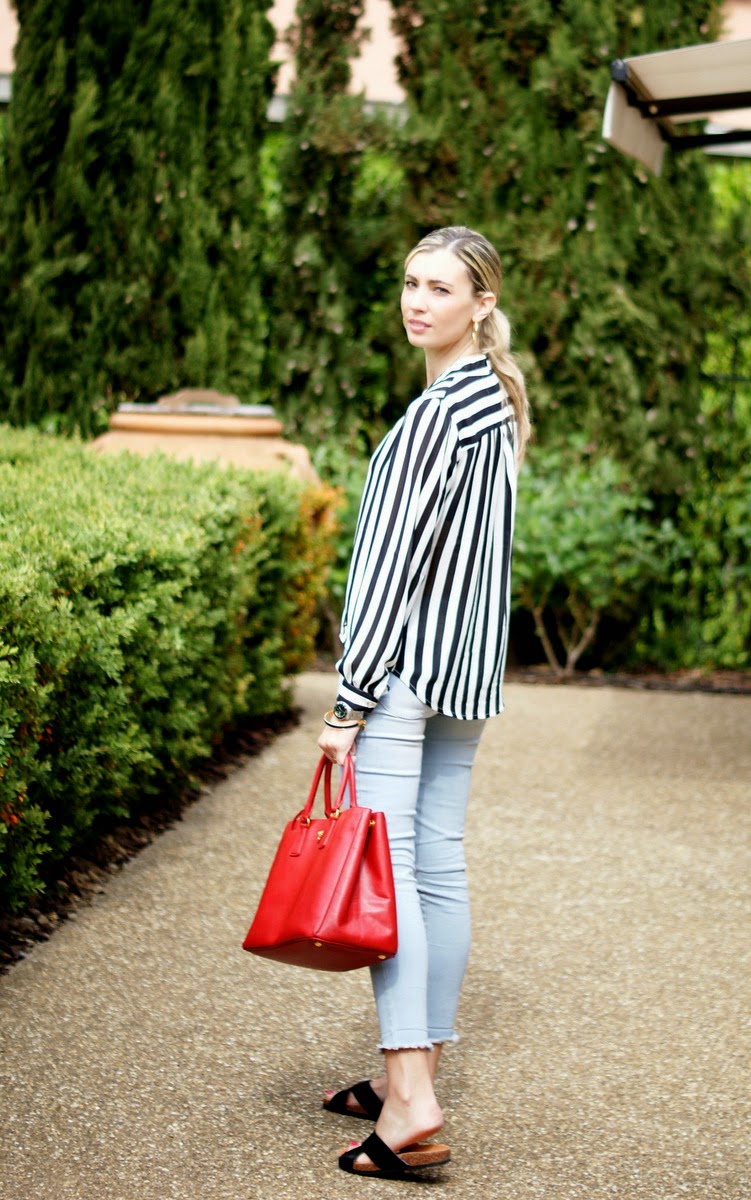 MI look era casi todo nuevo (menos mi bolso) con mis nuevos jeans baby blue de 6KS y mi nueva camisa a rayas de Sugarhill Boutique :)